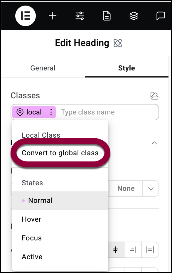 After creating an element using just the local class, you may decide that you want to reuse it by turning its properties into a global class. In these cases you can convert the properties of the local class into it a global class.