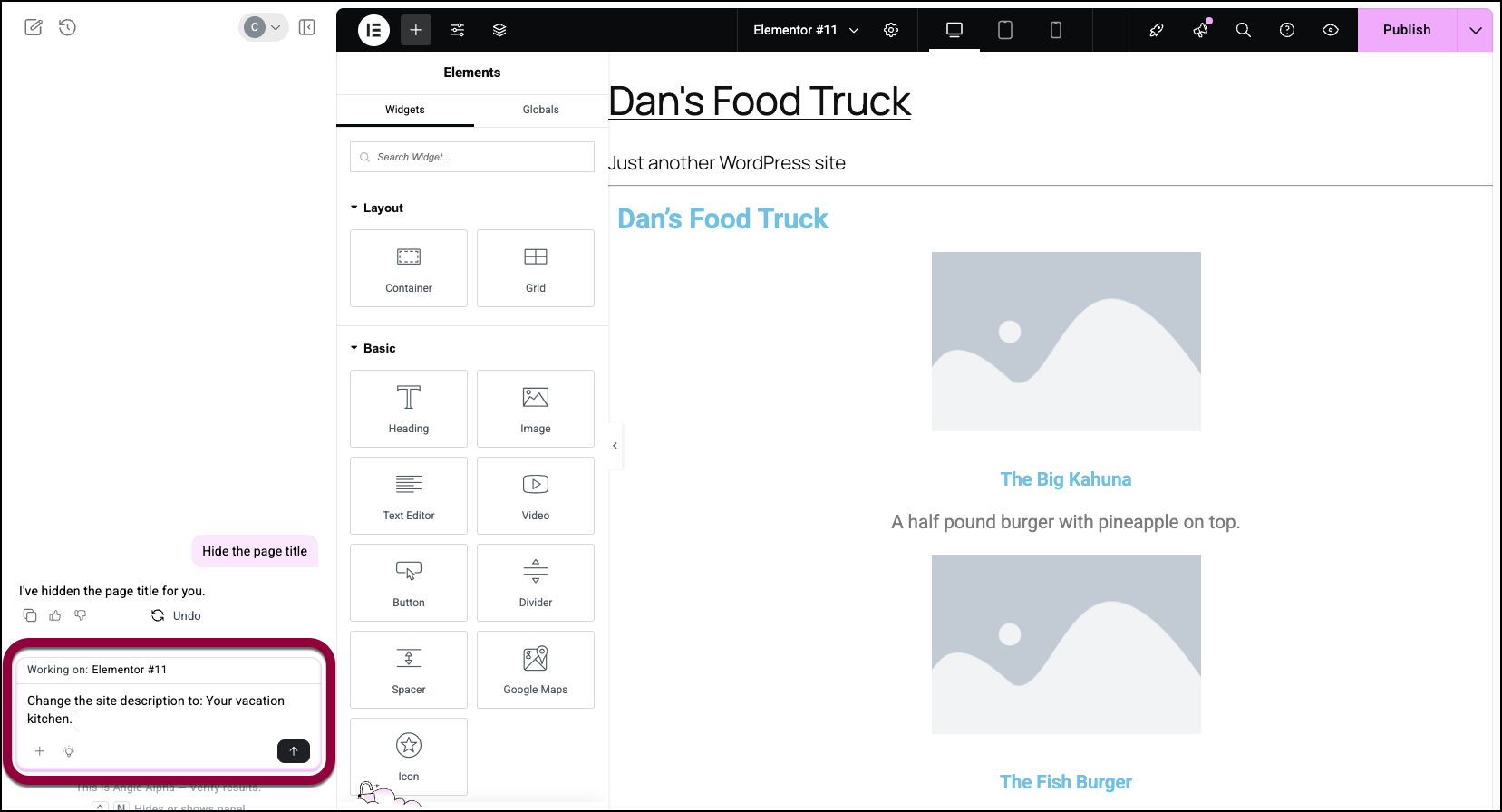 The site description is the default text which we should change. - In the Angie panel enter the prompt: