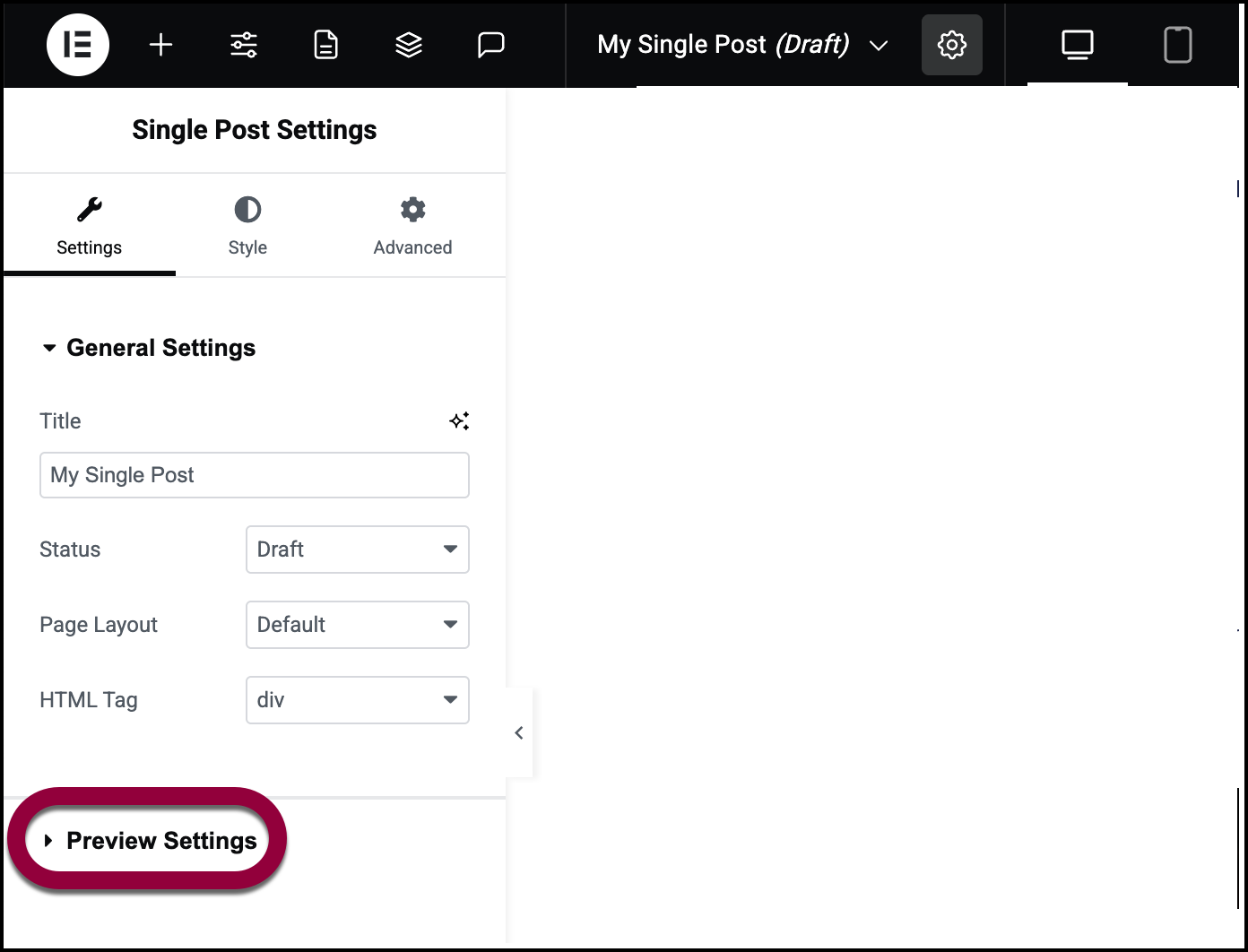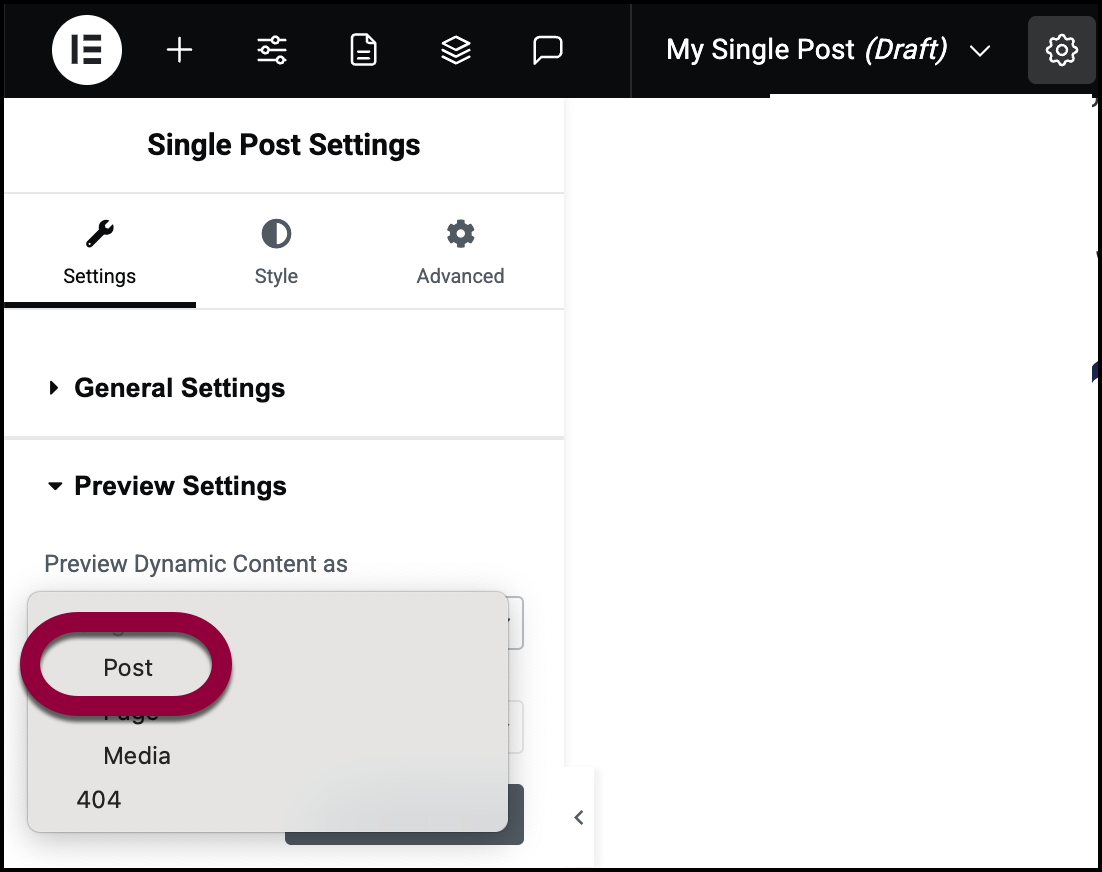 - Under Preview Dynamic Content select the post type you wish to preview. In this case we’ll choose Post.