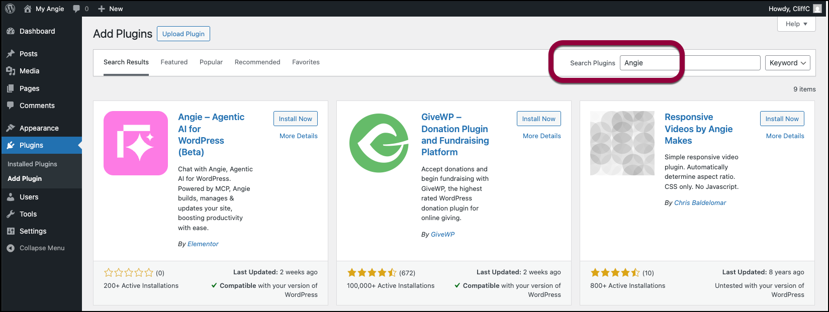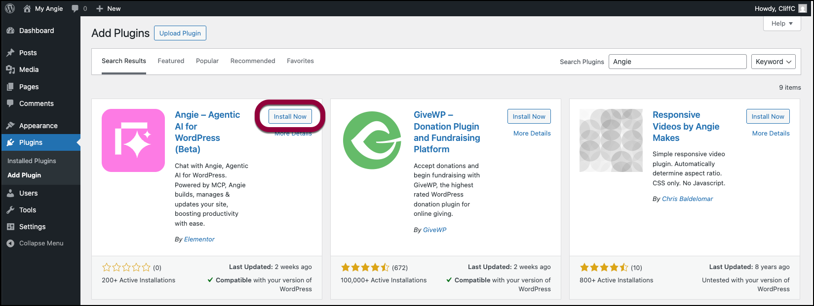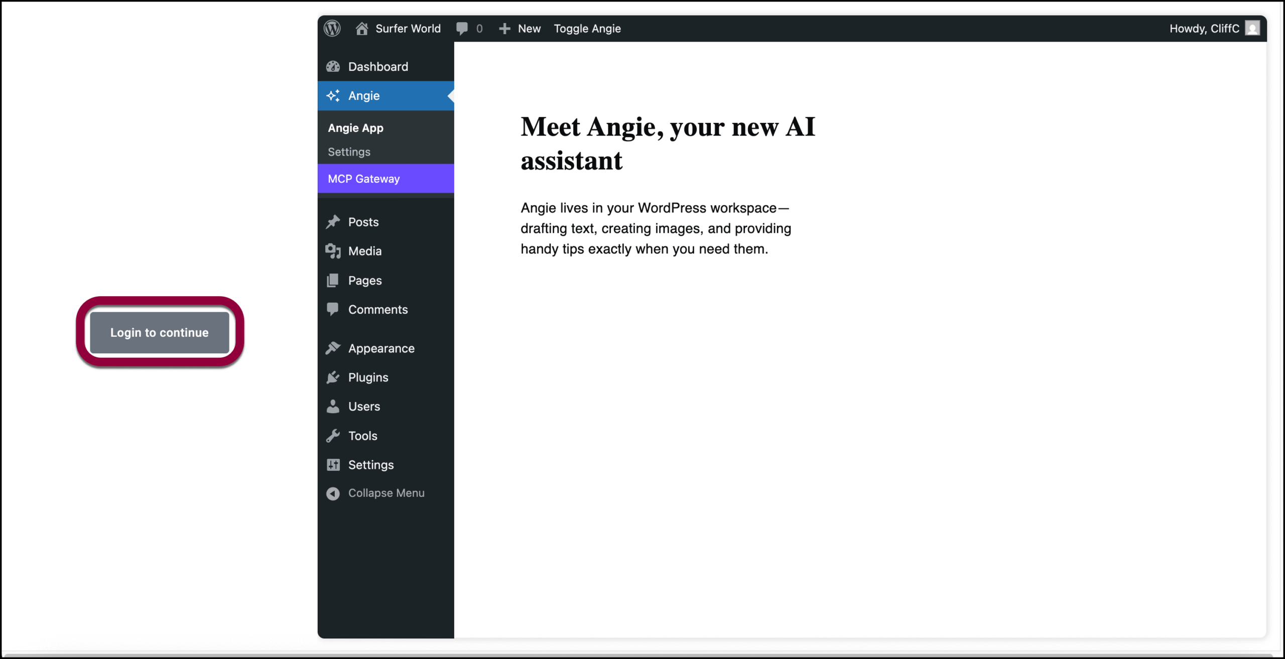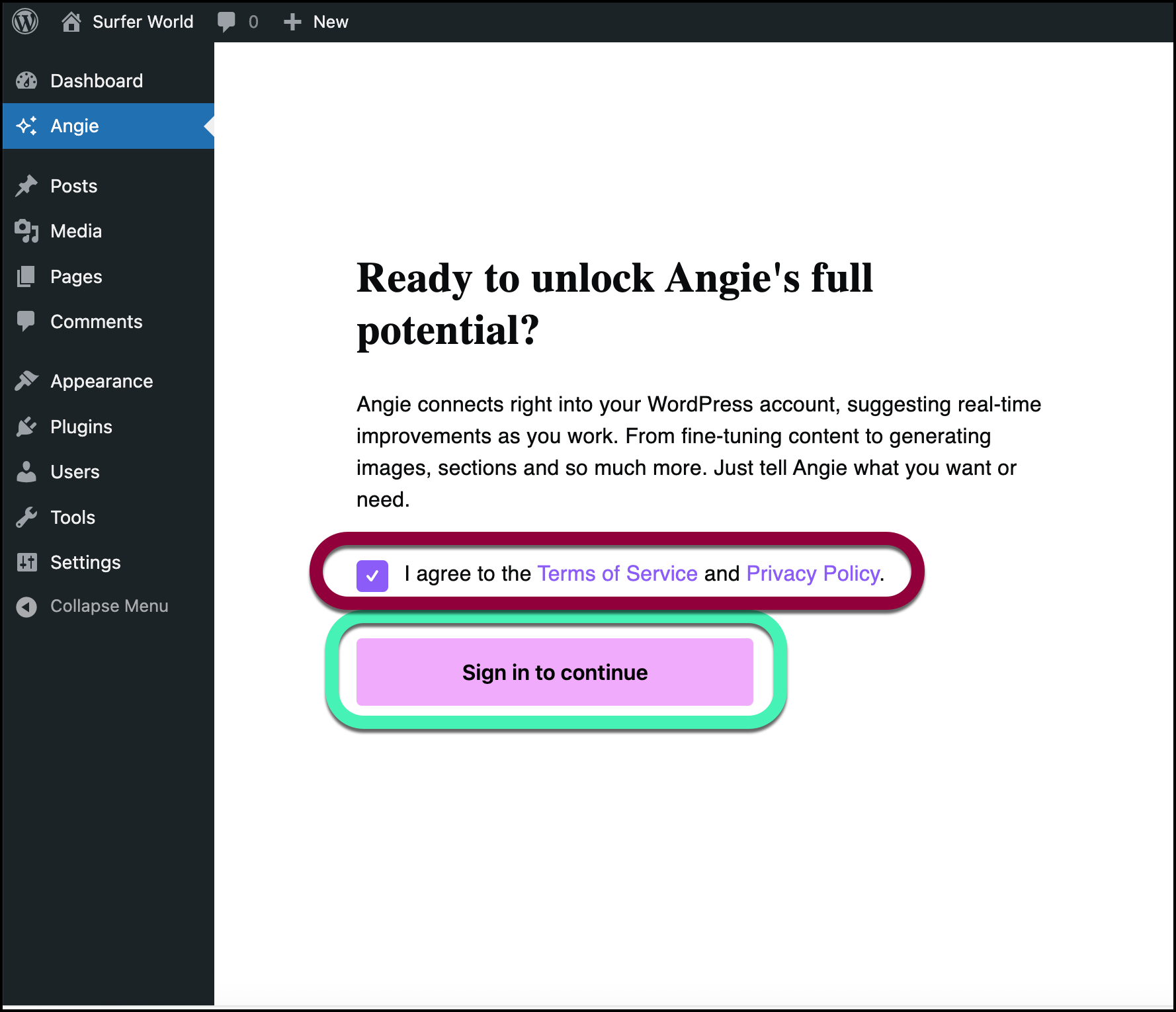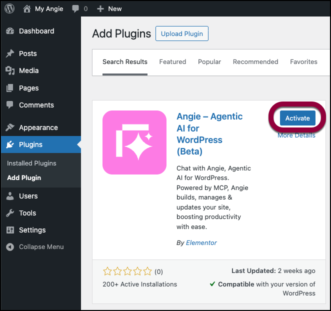 - Click the Angie option that now appears in your WP Admin panel.