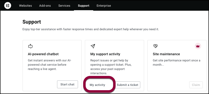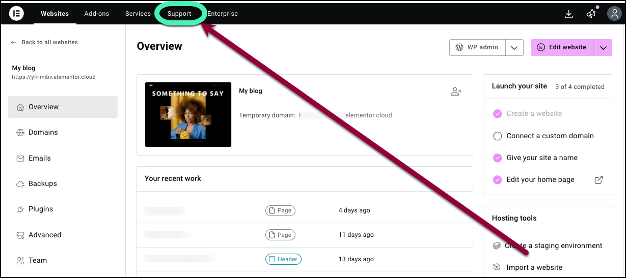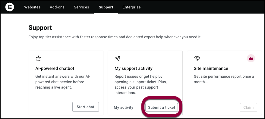 To submit a ticket via the WordPress dashboard (Elementor Hosting users only):
