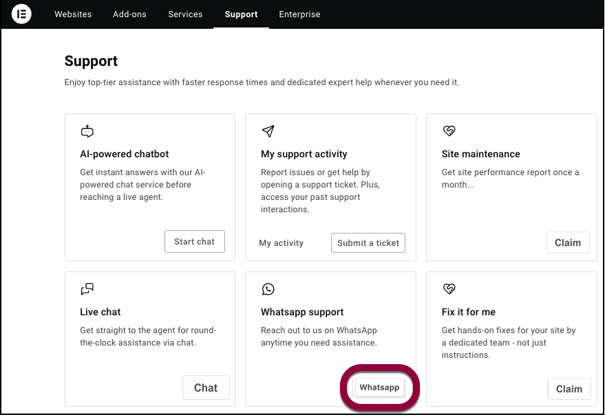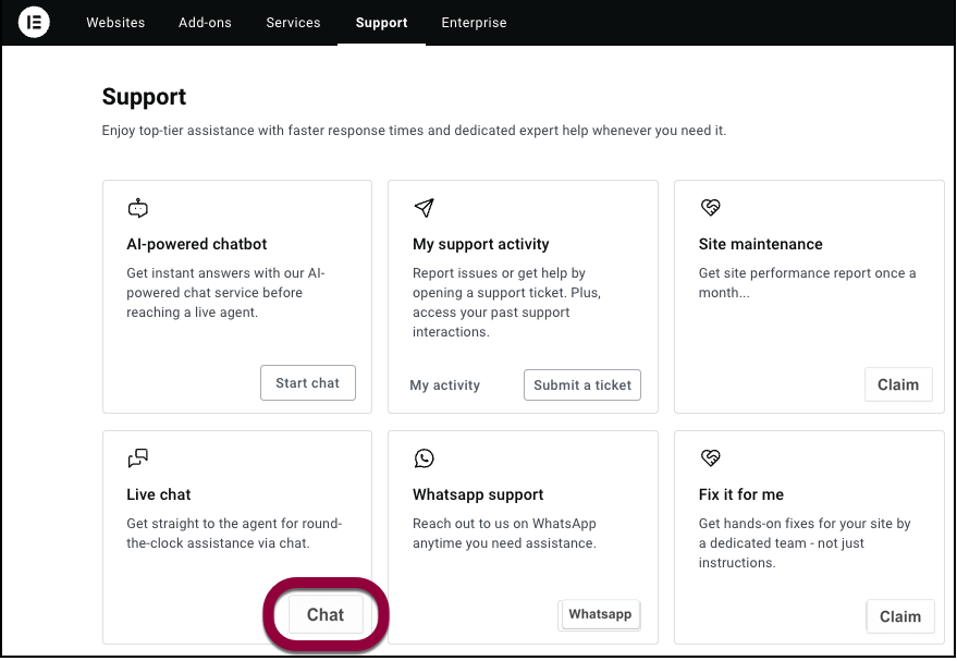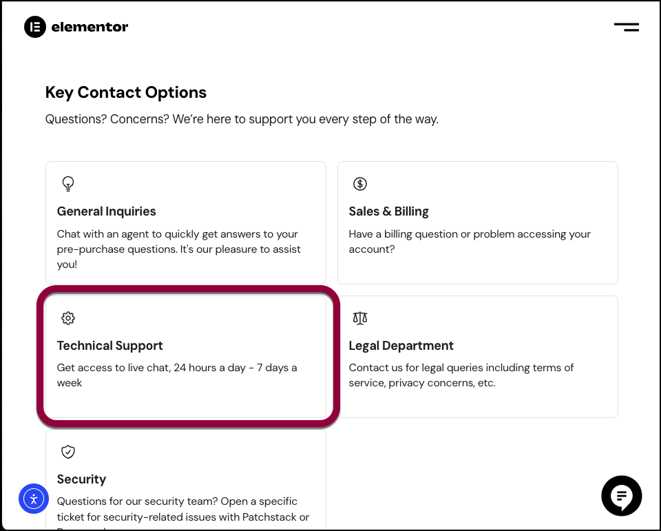 If you’re having trouble logging in, you can still contact support from the Elementor website from our support page or from the chat icon.