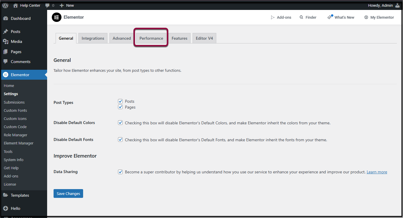 2. Navigate to Elementor > Settings and click the Performance tab.