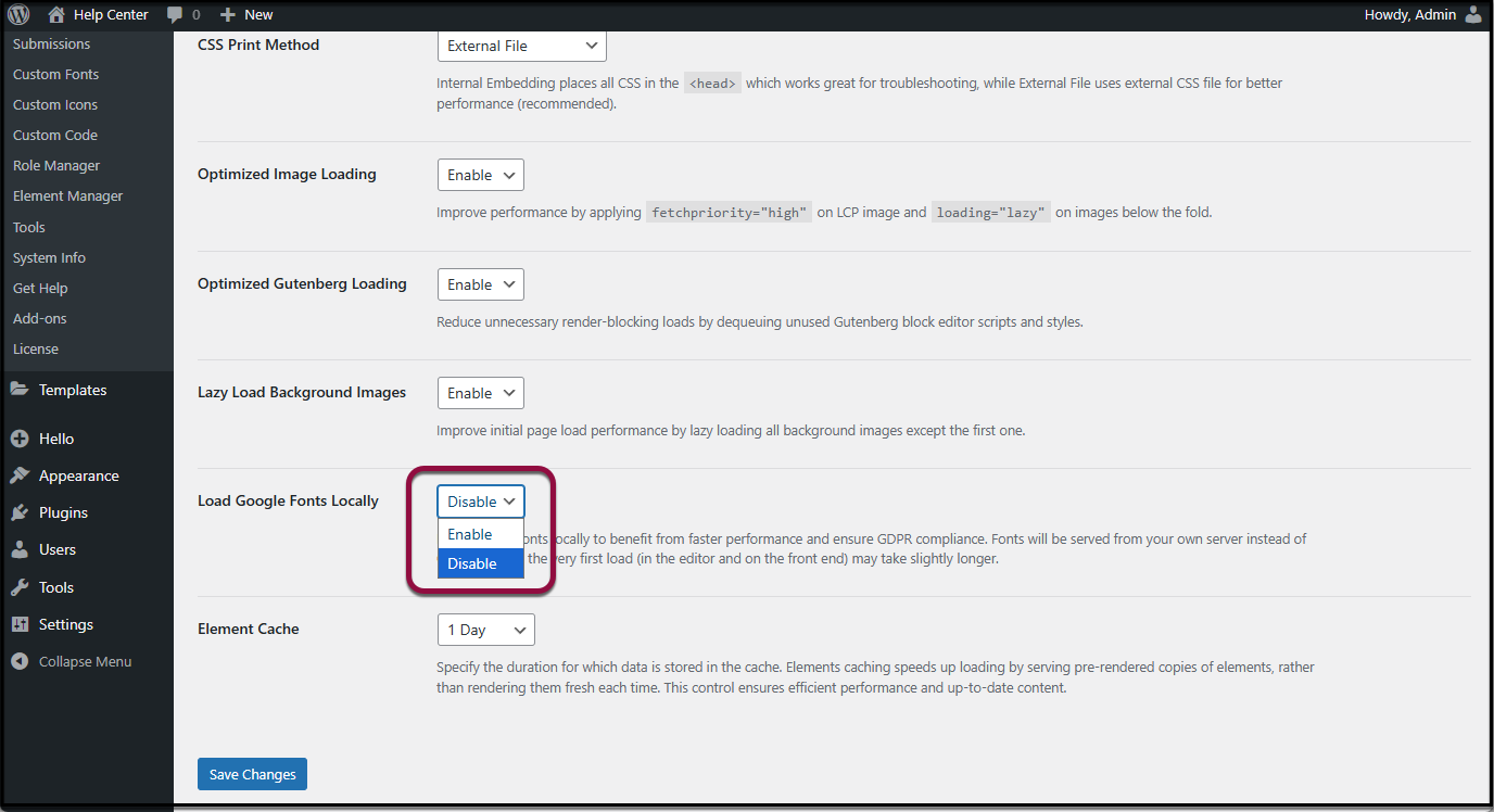 To address these issues, Elementor allows you to Load Google Fonts Locally, which lets your site serve fonts directly from your own server instead of Google’s CDN.