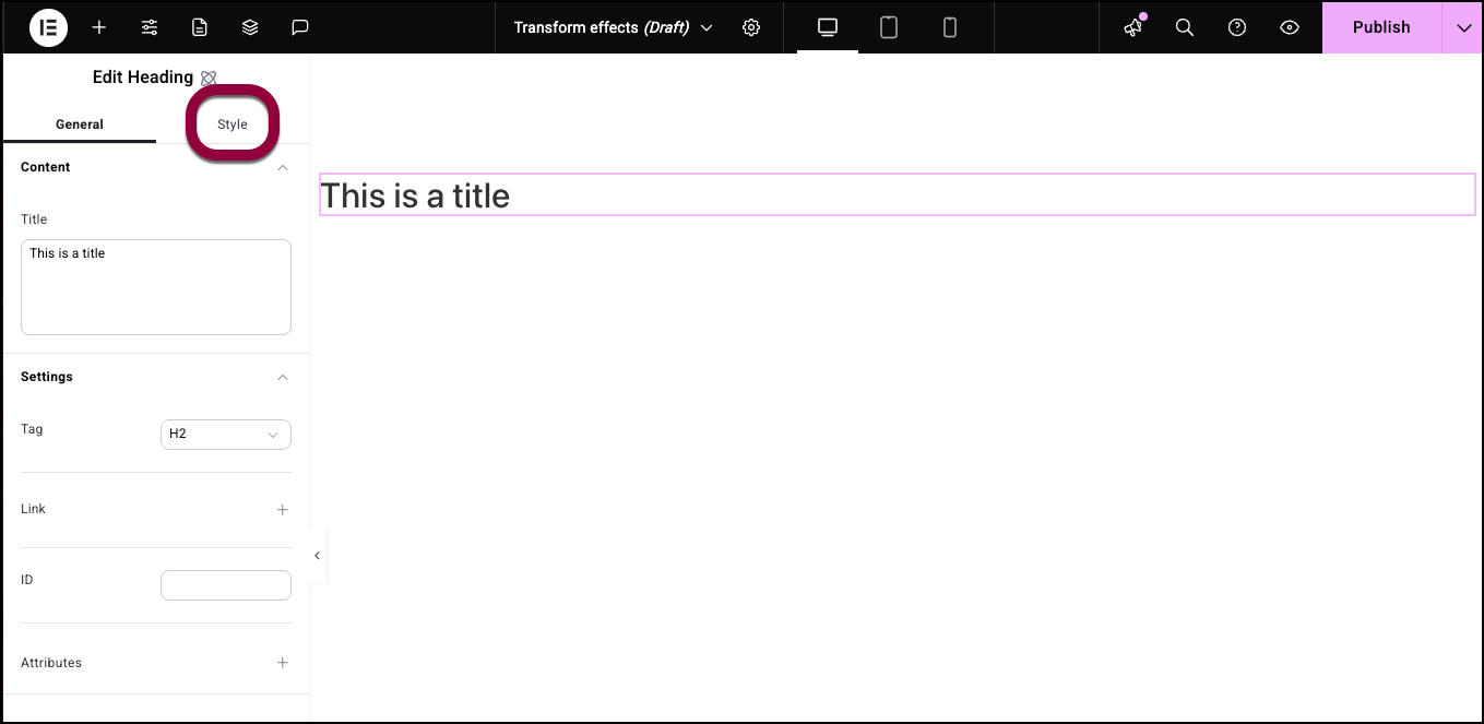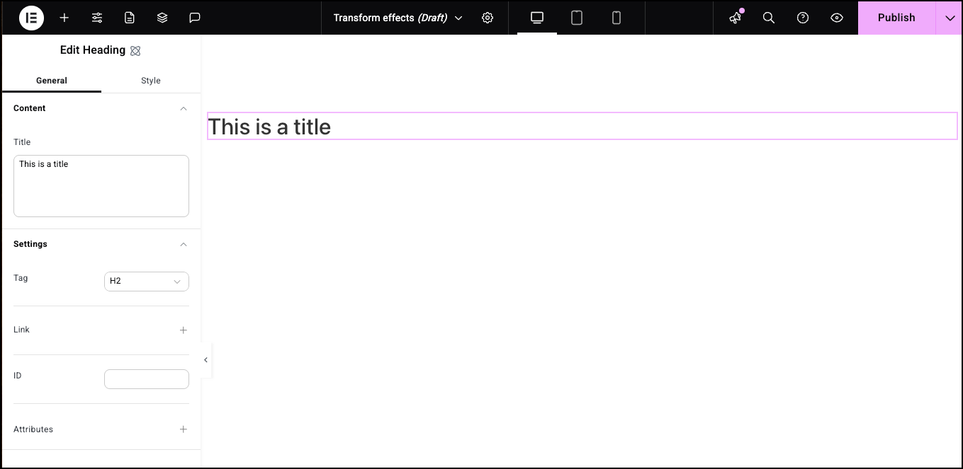 - Center the text of the Heading element. For details see Style tab – Layout for details.