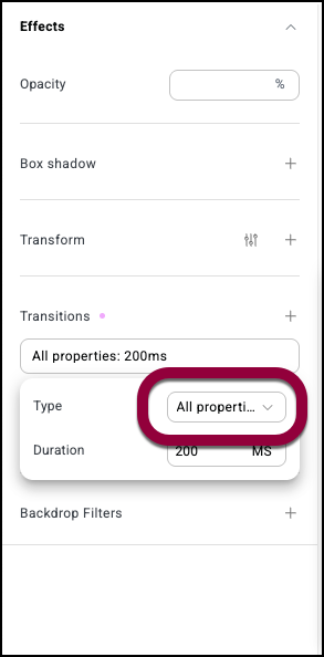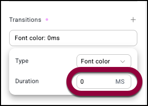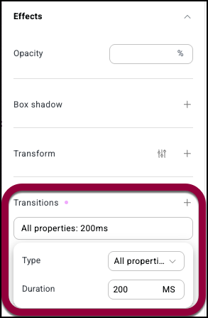 By default all properties transition simultaneously at 200 milliseconds (MS). All users can adjust the transition time, Pro users can adjust the transition times for individual properties.