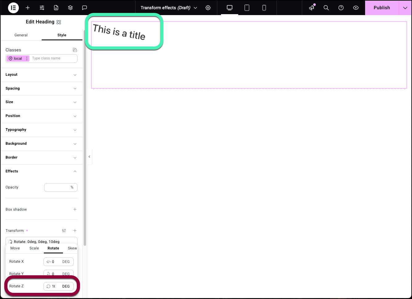 - Rotate: Spins an element around a specific point. Rotate is used as both as a stationary and hover effect.