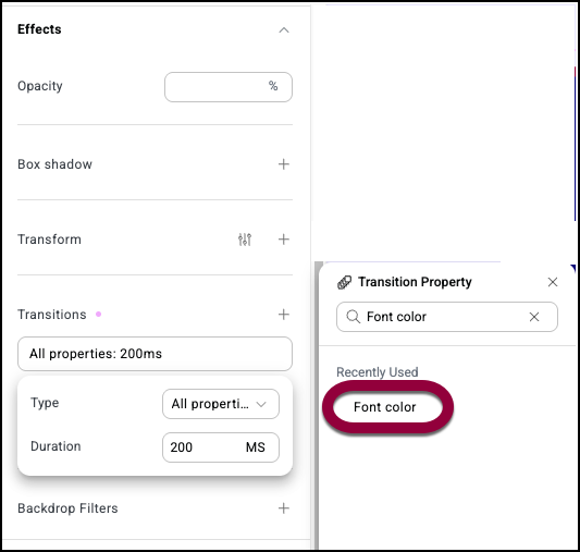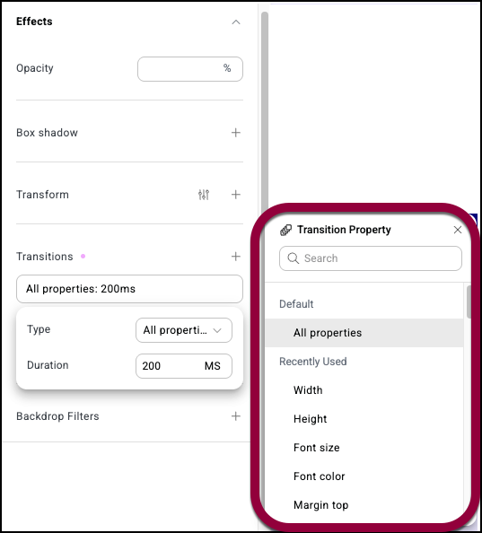 Transition Property show a list of all the properties you can set a transition property for. Recently set properties appear at the beginning of the list. If you have trouble locating a property, enter its name in the Search box.Note