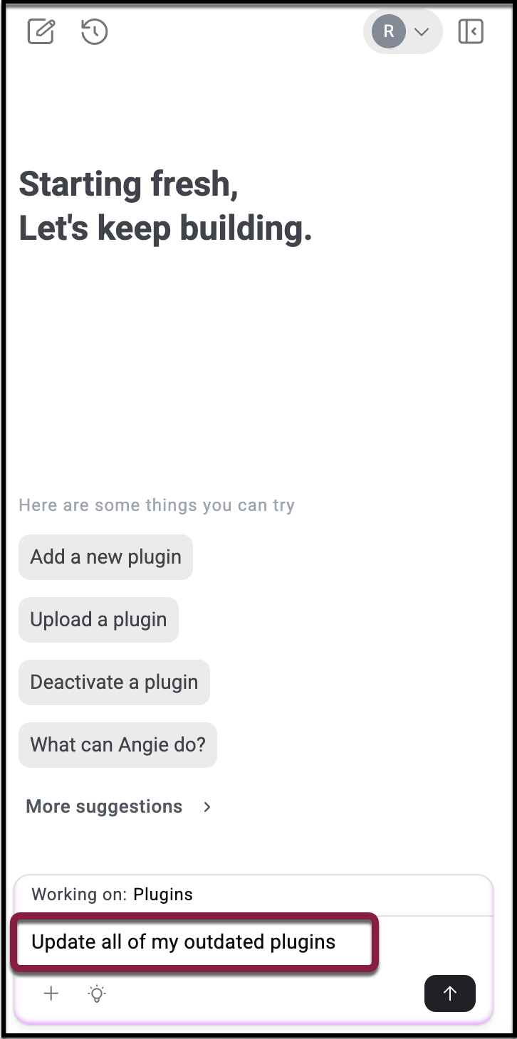 - From WP Admin, in the Angie panel, send the prompt. In this case, we’ll ask Angie to update all of our outdated plugins.